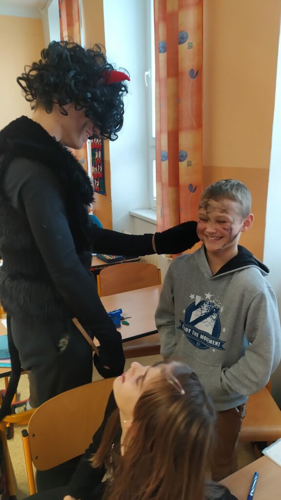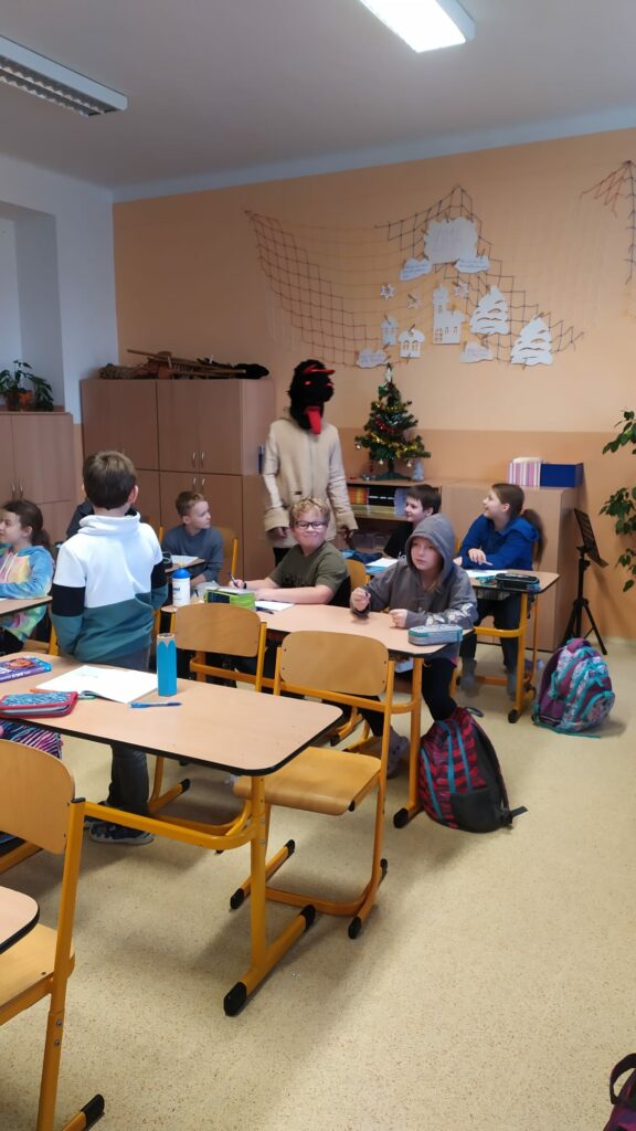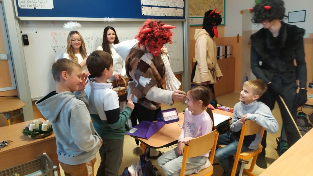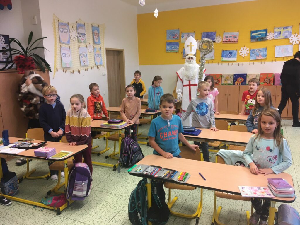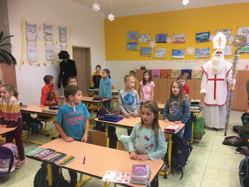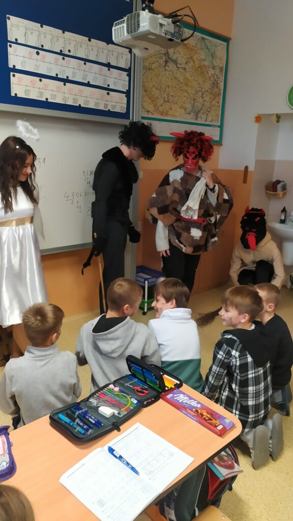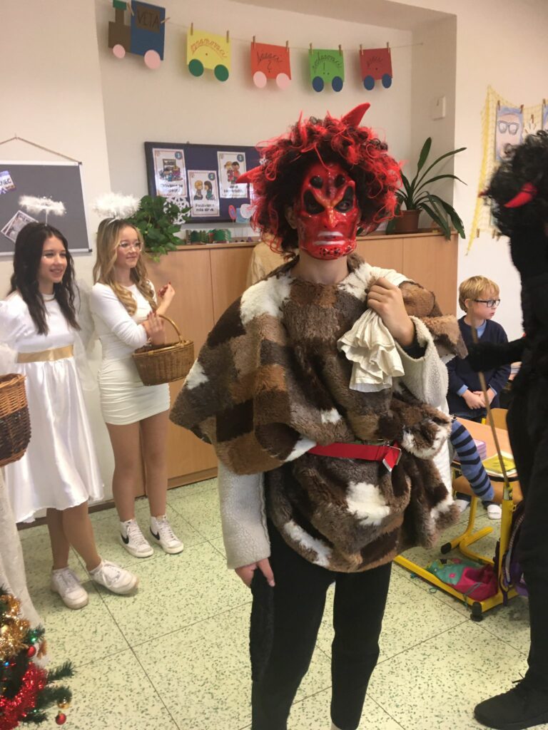Na naší škole opět řádili čerti. Starší děti se již tolik nebály, ale prvňáci jsou vždy vykulení, když se ve dveřích objeví čerti, pobíhají po třídě a hledají ty nezbedníky, kteří celý rok zlobí. Mikuláš s anděly je opět zachránil a všechny děti po zazpívání písničky nebo přednesu básně dostaly sladkou odměnu.