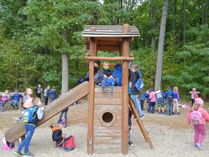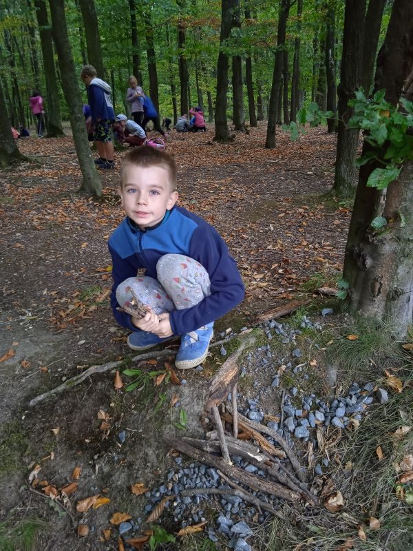 Rozšířili jsme si znalosti o přírodě a dozvěděli jsme se zajímavé informace o historii našeho města. Vyzkoušeli jsme si, kolik je nás potřeba k objetí starobylé lípy, památného stromu Sezimova Ústí. Tentokrát štěstí nestálo na naší straně a tak jsme nemohli pozorovat daňky z místní obory. Alespoň jsme si je prohlédli a přečetli o nich na informační tabuli u obory… V lese a i po cestě či na hřišti Pod květinou jsme si dosytnosti pohráli. Na programu jsme měli hry Signály, Káňe a Stref se! Proběhlo i tradiční lesní zpívání a vědomostní kvíz. A hlavně! Stavěli jsme si domečky z přírodnin a to nás moc a moc baví!!! Jak je vidět na fotkách, proběhla i svačinka a nožičky nikoho neboleli… Počasí nám přálo! Náladu jsme měli víc než dobrou a s písničkou na rtech jsme tento okruh hravě zvládli. Rozzářené dětské oči byly krásnou tečkou za touto povedenou společnou akcí!
