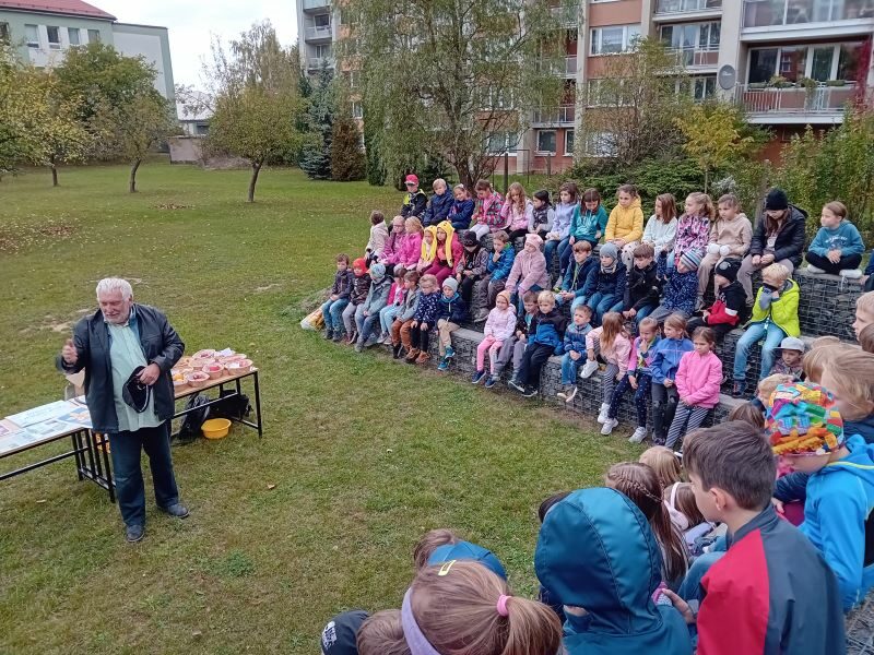K příležitosti dne stromů 20. 10. jsme si do školní družiny pozvali RNDr. Ing. Vladimíra Říhu, CSc. jednatele územního Českého zahrádkářského svazu. Pan Říha dětem popisoval život stromu, přiblížil jim některé jeho důležité funkce a celkově měly děti možnost dozvědět se hodně zajímavého například o komunikaci mezi stromy a i rostlinami. Děti pozorně poslouchaly, někteří dychtivě pana Říhu doplňovaly o své zkušenosti a znalosti. Podzimní odpoledne strávené na školní zahradě jsme si ještě zpestřili ochutnávkou jablíček, které děti přinesly ze svých zahrádek. Pan Říha nám odborně pohovořil nejen o odrůdách, které jsme měli možnost ochutnat a které byly určeny pomologem (ovocnářem) Ing. Zdeňkem Buzkem. Celé odpoledne nás provázelo krásné počasí a příjemná atmosféra provoněná nakrájenými jablíčky.