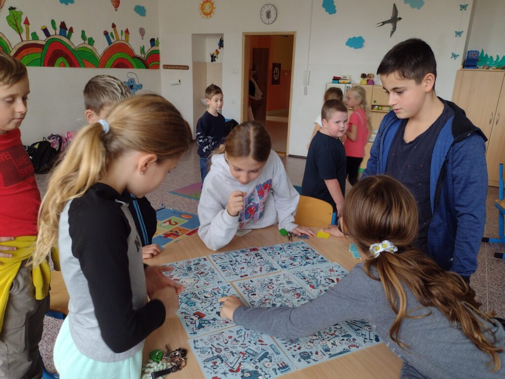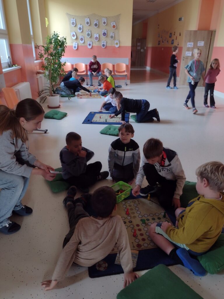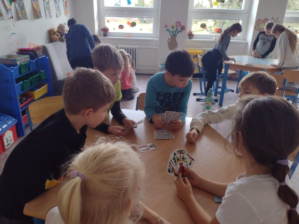Na začátku každé naší akce nám přichází vedení školy celodružinovku zahájit, popřát hladký průběh a hezké odpoledne. Dětem se též vysvětlují pravidla akce a celková organizace, proto se všichni scházíme na chodbě v prostorách před ŠD. Po úvodu si žáci obchází stanoviště nachystaná ve družinách či na chodbě a hrají dle svého výběru a uvážení deskové, didaktické a karetní hry. Letos se hrálo: Dobble, Člověče, Dáma, Prší, Pexeso pro uši, Mikádo, Kolíčky, Obličeje, Nečekej a navlékej, Ubongo, Gargamelova past, Žížaly, Pictureca, Unicorns, Grabolo a Jméno – město. Volili jsem hry, které jsou v jednotlivých družinách oblíbené a pro děti zábavné a také hry, která nemají všechna oddělení stejné, aby naši malí žáci dostali příležitost poznat něco nového a zpestřit si den. Celodružinovce předchází týden, kdy se děti seznamují s pravidly her a tak je v pátek už nic nepřekvapí a nikde si nejsou nejistí. Na jednotlivá stanoviště se mohou vrátit kolikrát chtějí a též výběr kamarádů pro hru, tedy soupeřů, záleží na nich. Je pěkné pozorovat smíšené skupiny dětí, jejich společné setkávání…Za vítězství ve hře je odměnou papírový lísteček, který je, na konci při vyhodnocení, takovým důkazem úspěšnosti. Nebojte se, celá akce je nastavena tak, aby se každému podařilo získat alespoň jeden či dva lístečky… Nejde o první, druhé, třetí místo! Jde o radost ze hry a kamarádství.