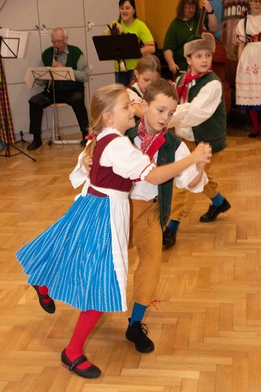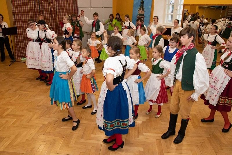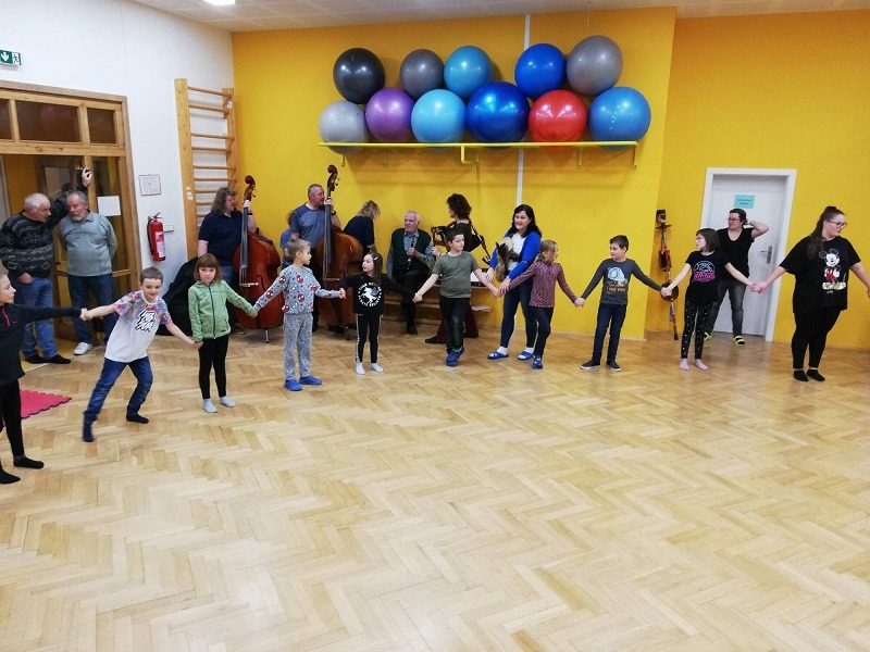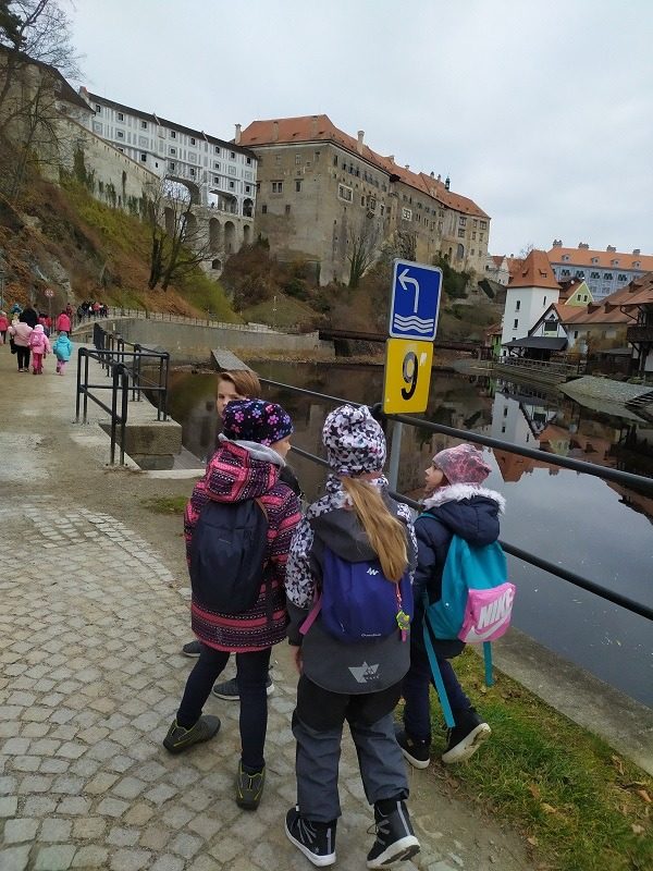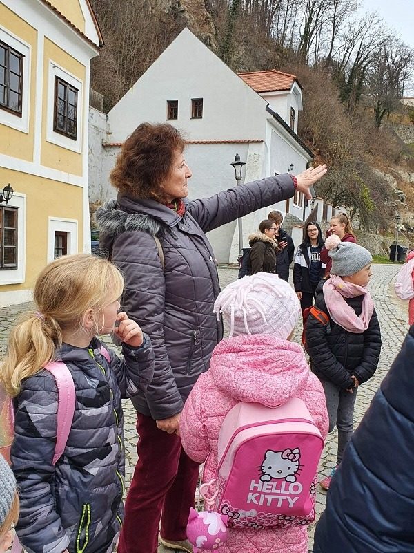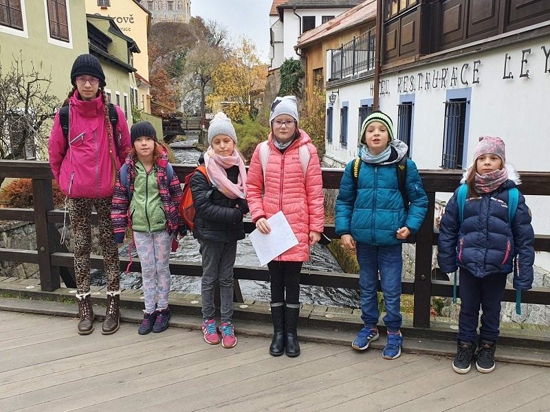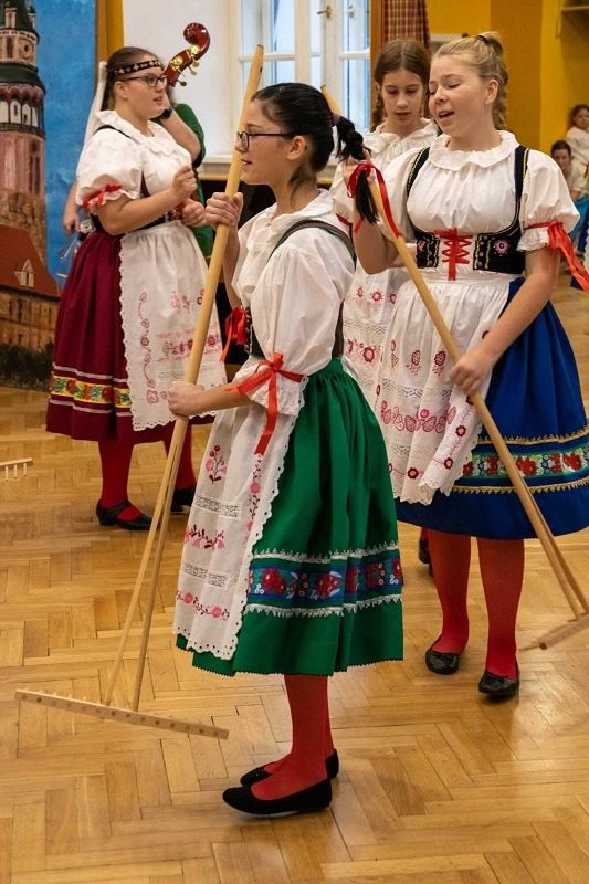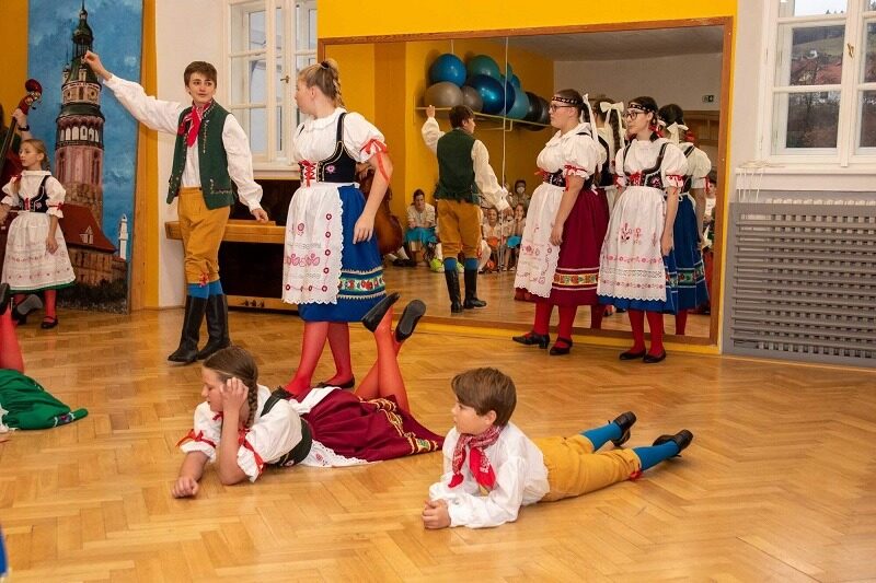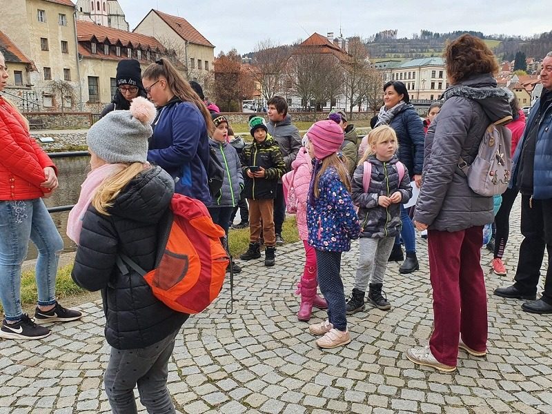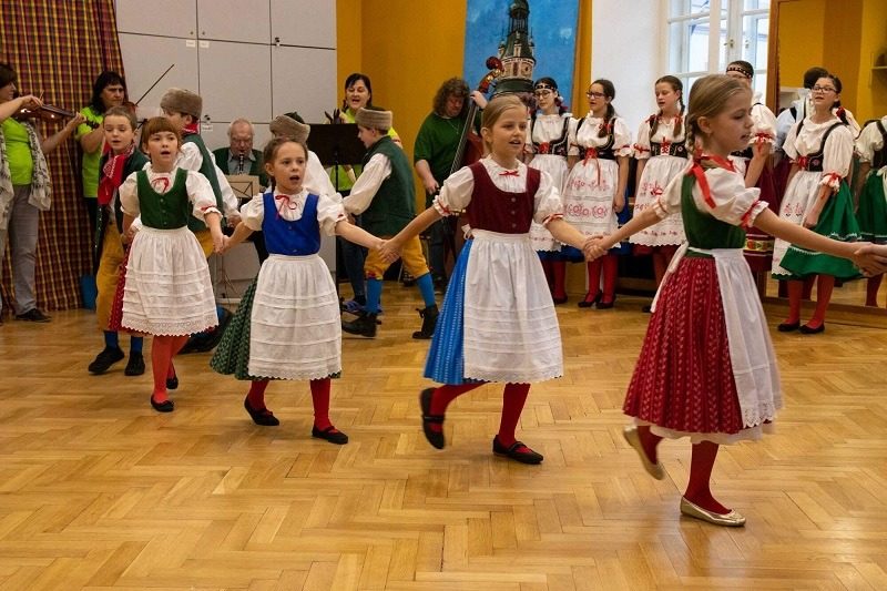 Mohli jsme se konečně za nimi rozjet. Cesta vlakem byla sice dlouhá, ale pro někoho to byl zážitek, neboť to bylo poprvé. Na nádraží na nás čekala dudačka krumlovského souboru Zlatka, která nás vedla večerním městem a temnými zákoutími Krumlova za doprovodu jejího příjemného vyprávění. Po příchodu do domu dětí a mládeže nás čekala doslova hostina a poté hudební hry s nácvikem našeho společného programu. Po nich byl čas uložit se ke spánku. Spát ve spacáku na karimatce vedle svého kamaráda bylo pro mnohé dalším jedinečným zážitkem. Ráno zabalit, nasnídat a vyrazit vstříc historickému městu, kde byla pro oba soubory i jejich muzikanty připravena pátrací hra. Užili jsme si to všichni a našli to, co jsme měli. Po vynikajícím obědě nás čekalo vystoupení pro veřejnost. Povedlo se a my odjížděli s dobrými pocity a dojmy.