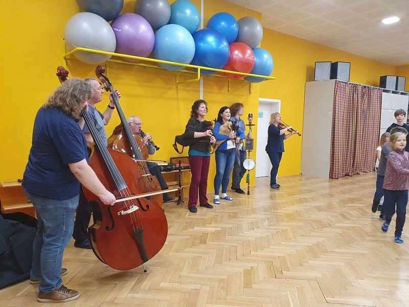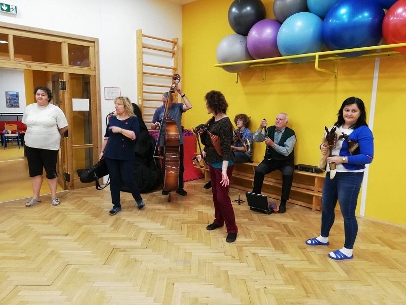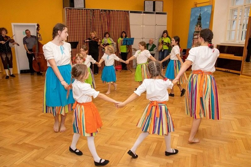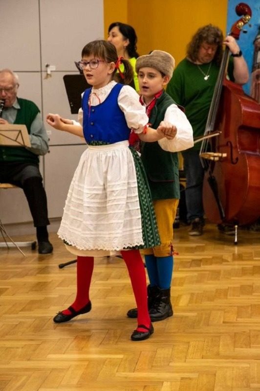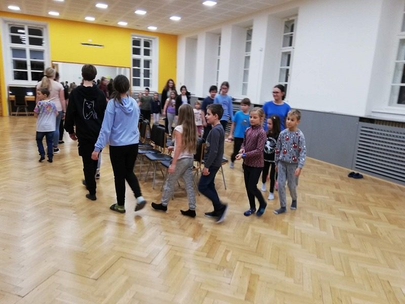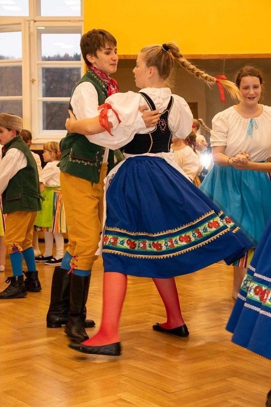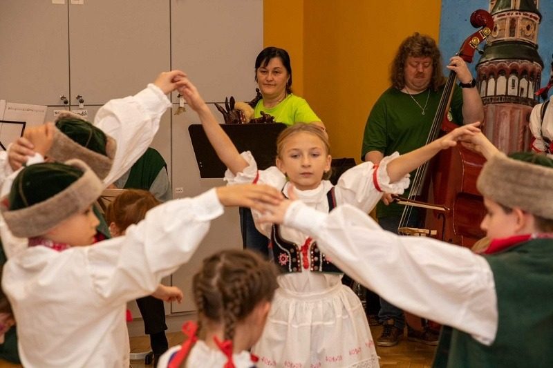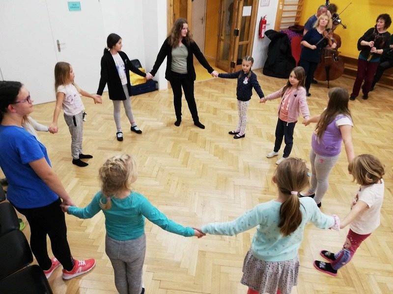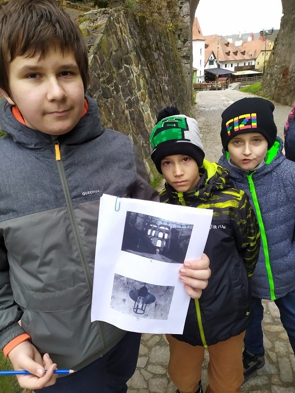 Mohli jsme se konečně za nimi rozjet. Cesta vlakem byla sice dlouhá, ale pro někoho to byl zážitek, neboť to bylo poprvé. Na nádraží na nás čekala dudačka krumlovského souboru Zlatka, která nás vedla večerním městem a temnými zákoutími Krumlova za doprovodu jejího příjemného vyprávění. Po příchodu do domu dětí a mládeže nás čekala doslova hostina a poté hudební hry s nácvikem našeho společného programu. Po nich byl čas uložit se ke spánku. Spát ve spacáku na karimatce vedle svého kamaráda bylo pro mnohé dalším jedinečným zážitkem. Ráno zabalit, nasnídat a vyrazit vstříc historickému městu, kde byla pro oba soubory i jejich muzikanty připravena pátrací hra. Užili jsme si to všichni a našli to, co jsme měli. Po vynikajícím obědě nás čekalo vystoupení pro veřejnost. Povedlo se a my odjížděli s dobrými pocity a dojmy.