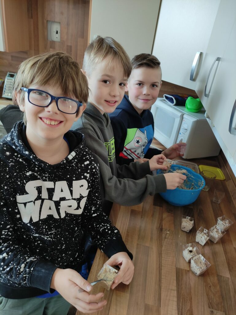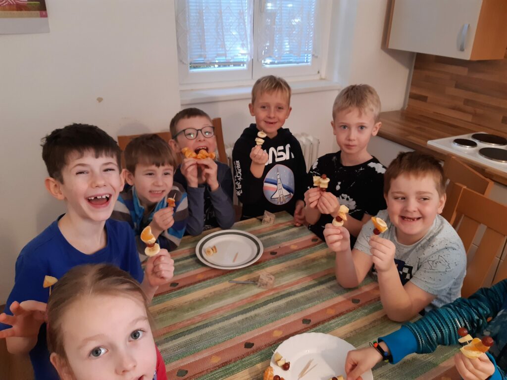 Nejzábavnější byl pro děti pobyt ve školní kuchyňce. Měly příležitost ochutnat výbornou vločkovou kaši, kterou pro ně paní lektorka připravila. Výborná opravdu byla, protože všichni baštili jako o závod. Potom si děti připravily vlastní zdravé jídlo. Menší děti ovocné špízy, větší děti si přidaly ještě závitky z tortilly, sýrů a polníčku.