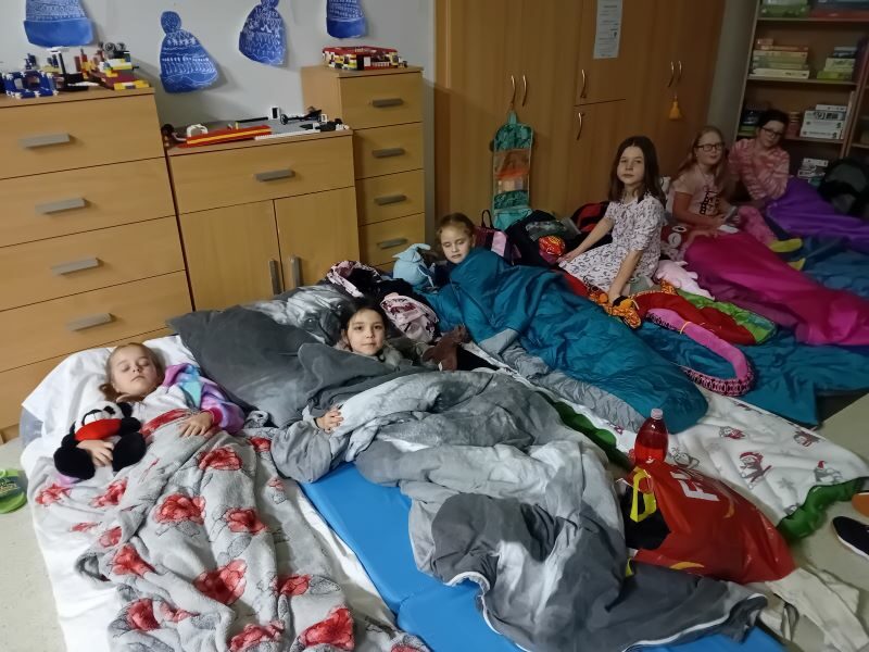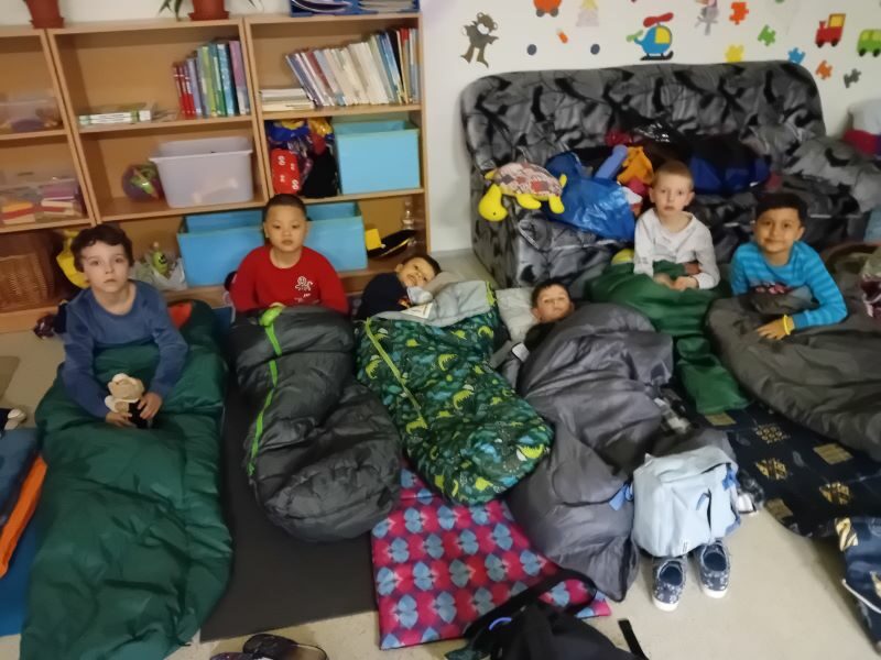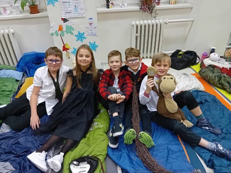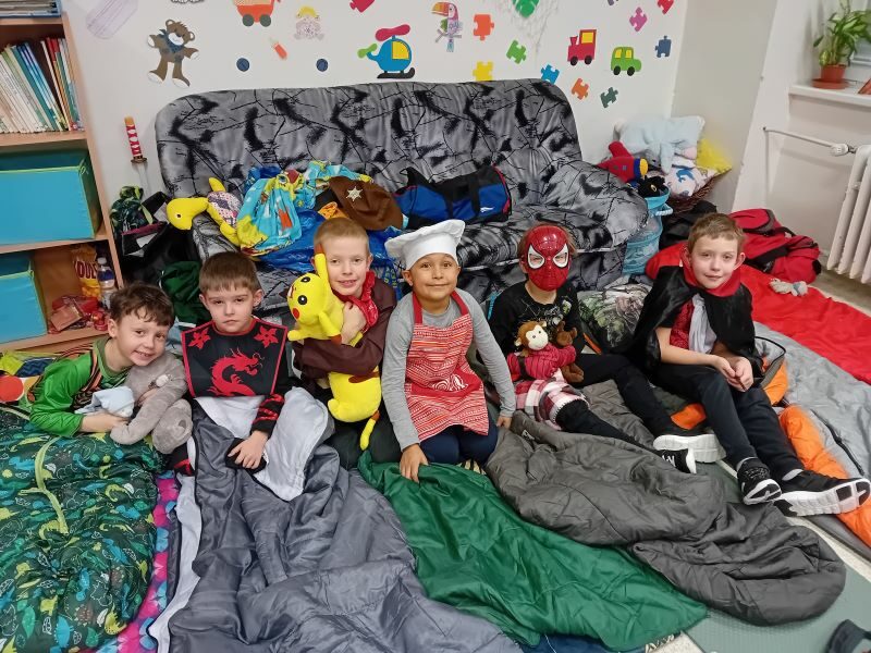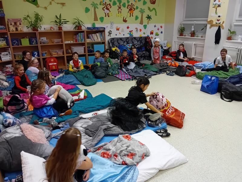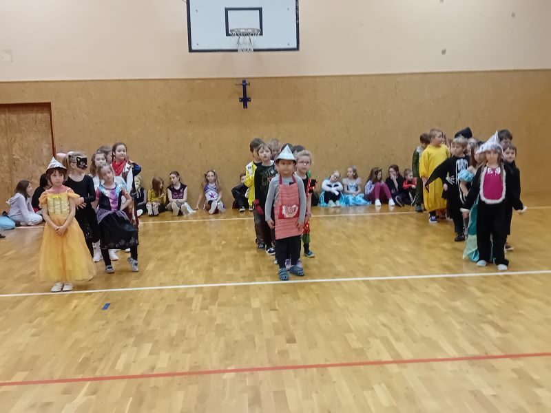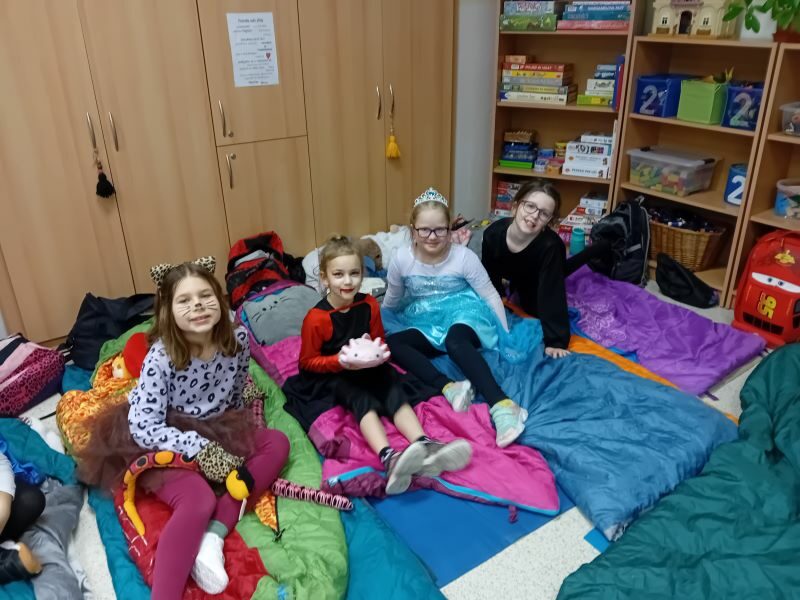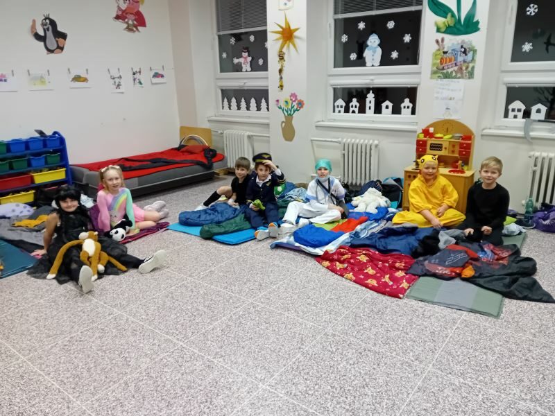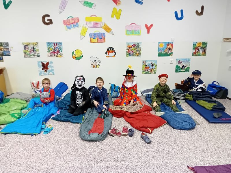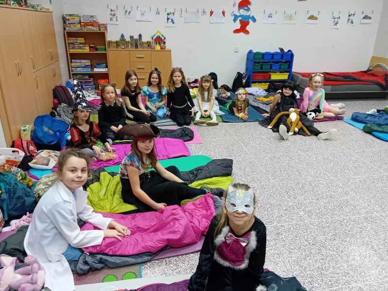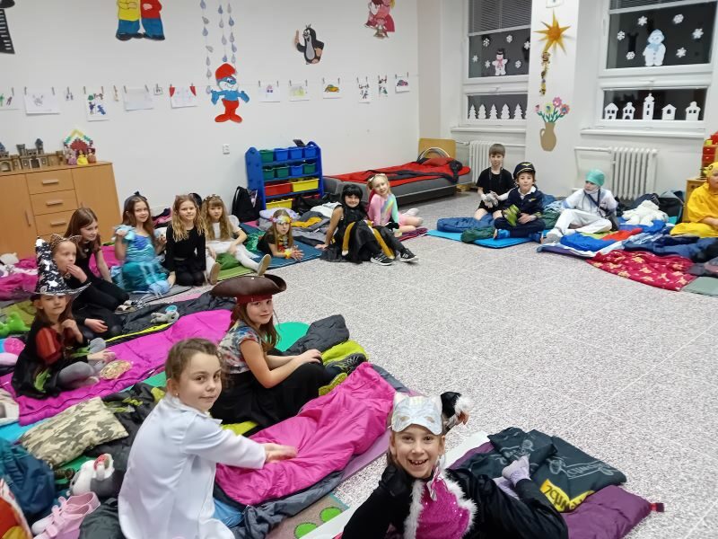 V pátek 23. 2. jsme se v 18,00 hodin sešli ve svých odděleních ŠD. Přicházeli jsme s velkým nadšením a očekáváním, také trošku s obavou, jestli to zvládneme. Vždyť pro některé z nás to byla premiéra, spát mimo domov a ještě ve škole! Páteční program byl opravdu pestrý a my si ho náležitě užívali. Každý jsme si ve svém oddělení nachystali „postýlku“ a začali se připravovat na Karneval. Ten byl zahájen v 19,00 hodin v tělocvičně školy a to promenádou masek, následovalo předtančení Mažoretek a pak už karnevalové hry a rejdění. Disco koule nám dokreslila atmosféru opravdické „párty“ a o smích, taneční kreace a zábavu nebyla nouze… S dobrým pocitem, plni krásných zážitků jsme si zalezli do svých pelíšků – spacáků a po pohádce na dobrou noc, spali jako, když nás do vody hodí. Sobotní dopoledne bylo neméně dobrodružné, sbalit spacák, to byla výzva! Vše se nakonec podařilo! Společná noc, karneval a kamarádi, komu by se chtělo domů? Nám moc ne, ale protože už víme, jak se spí ve škole, rádi si to za rok zase zopakujeme!!!