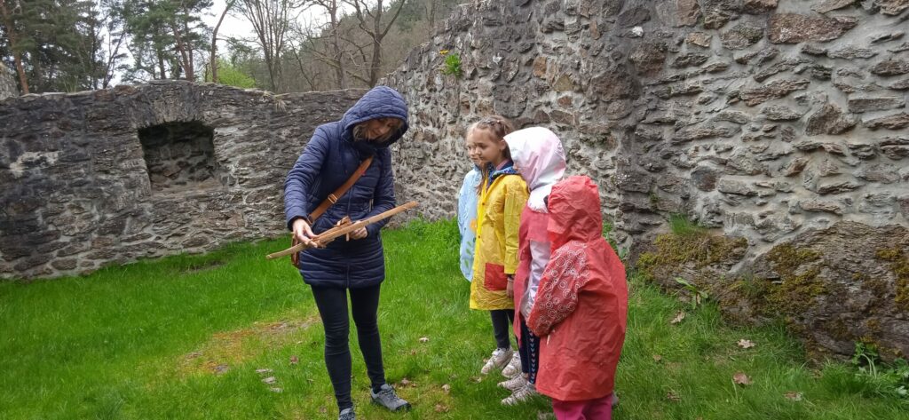 Letos nám počasí opravdu nepřálo a pláštěnky jsme vytáhli jen chvíli po zahájení cesty na hrad a nechali je na sobě celé odpoledne!!! Bohužel, i když nadšení dětí z akce bylo veliké, déšť taky!!! Prostor hradu se stal nevlídným a nebezpečným. Kvůli hrozícím úrazům, kluzkému prostředí a rozmáčeným rekvizitám jsme museli hru předčasně ukončit…To se nestalo za celou dobu pořádání této „celodružinovky“. Dospělým i dětem to bylo velmi líto, ale z hlediska bezpečnosti to nešlo jinak. Náladu jsme si zkazit nenechali! Po dobré svačince a dobrůtce z místní restaurace jsme se vrátili zpět do družiny a při čekání na rodiče si pohráli ještě ve třídě.
