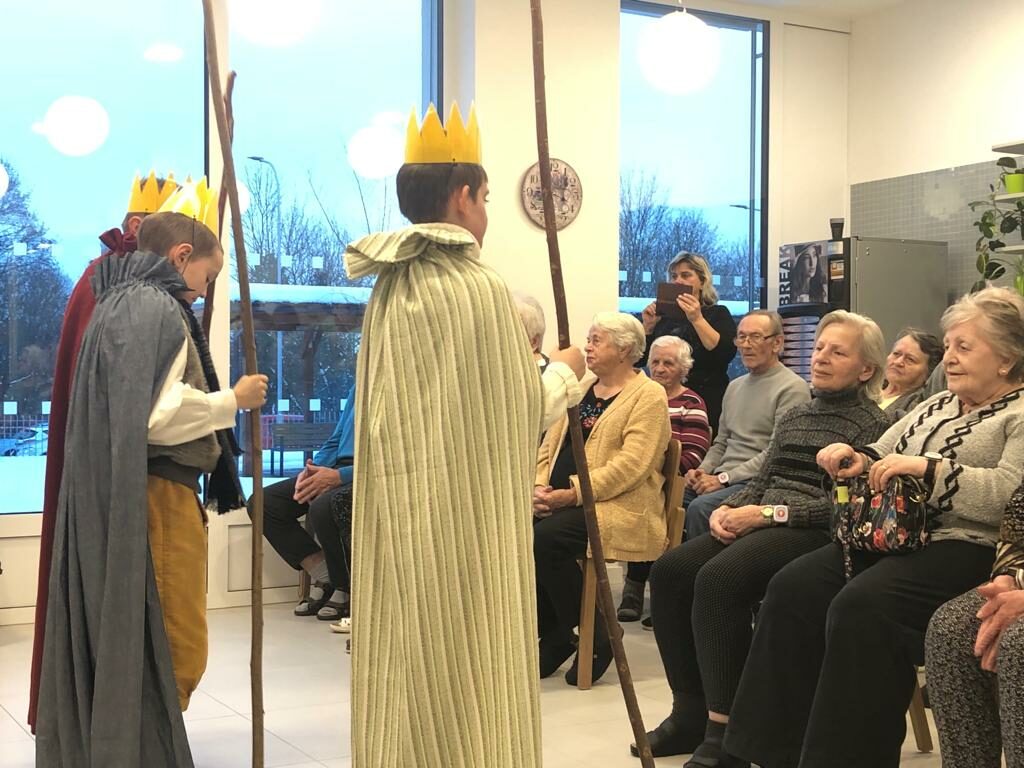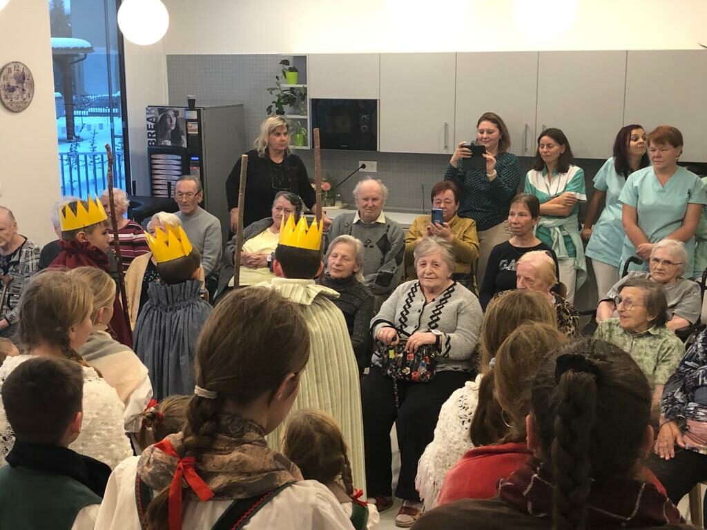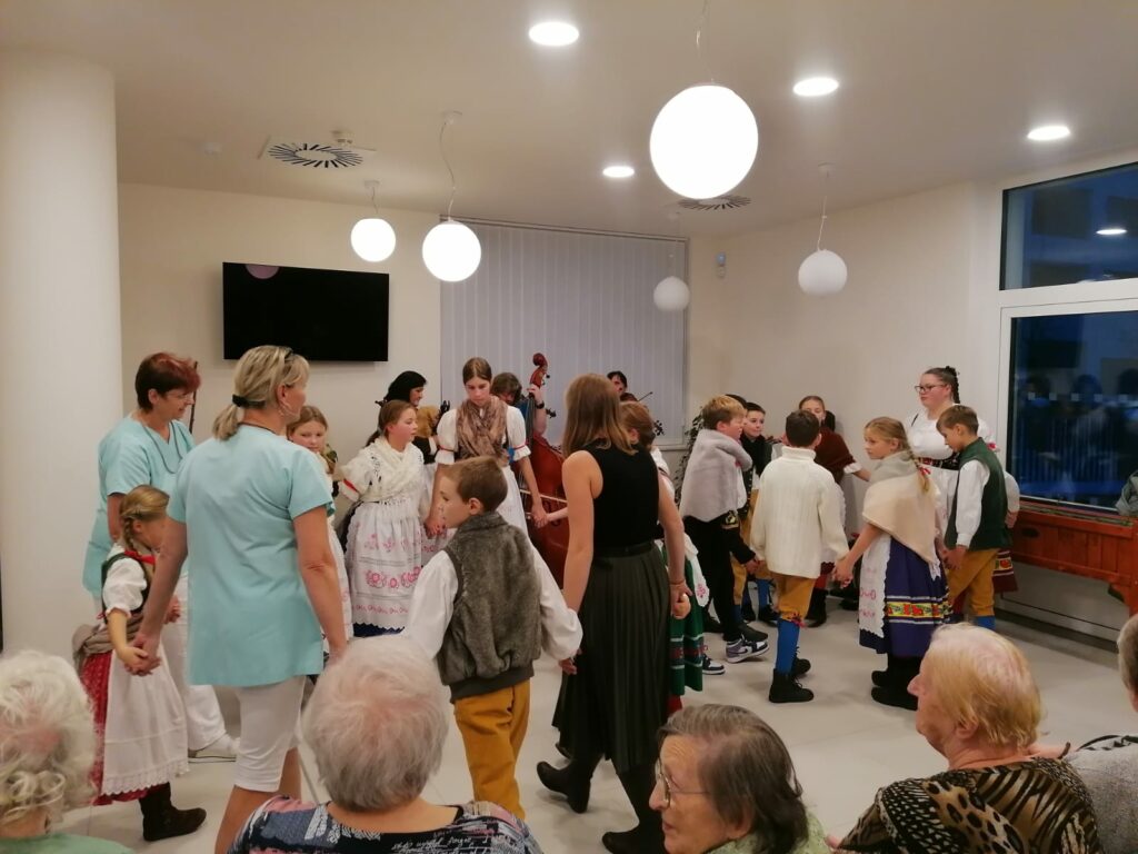 Další vystoupení bylo věnováno seniorům se speciálním režimem v G centru Tábor. Děti nejenom rozveselily klienty tohoto zařízení, ale také přinesly do centra radost a svěžest. Setkání mezi generacemi, spojené s tradicí a folklórem, má jedinečnou schopnost vytvářet mosty mezi lidmi a nabízet příležitost sdílet radost ze života.