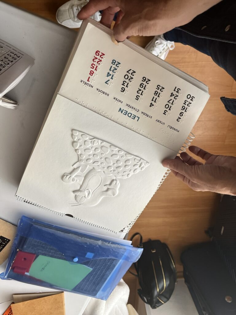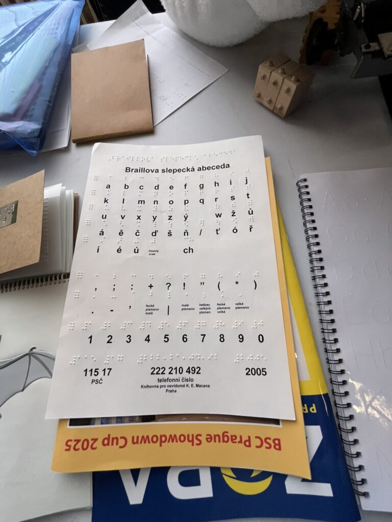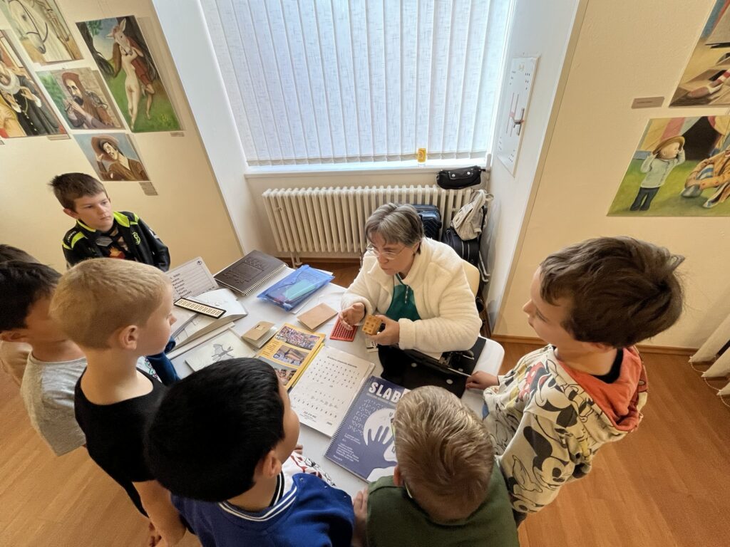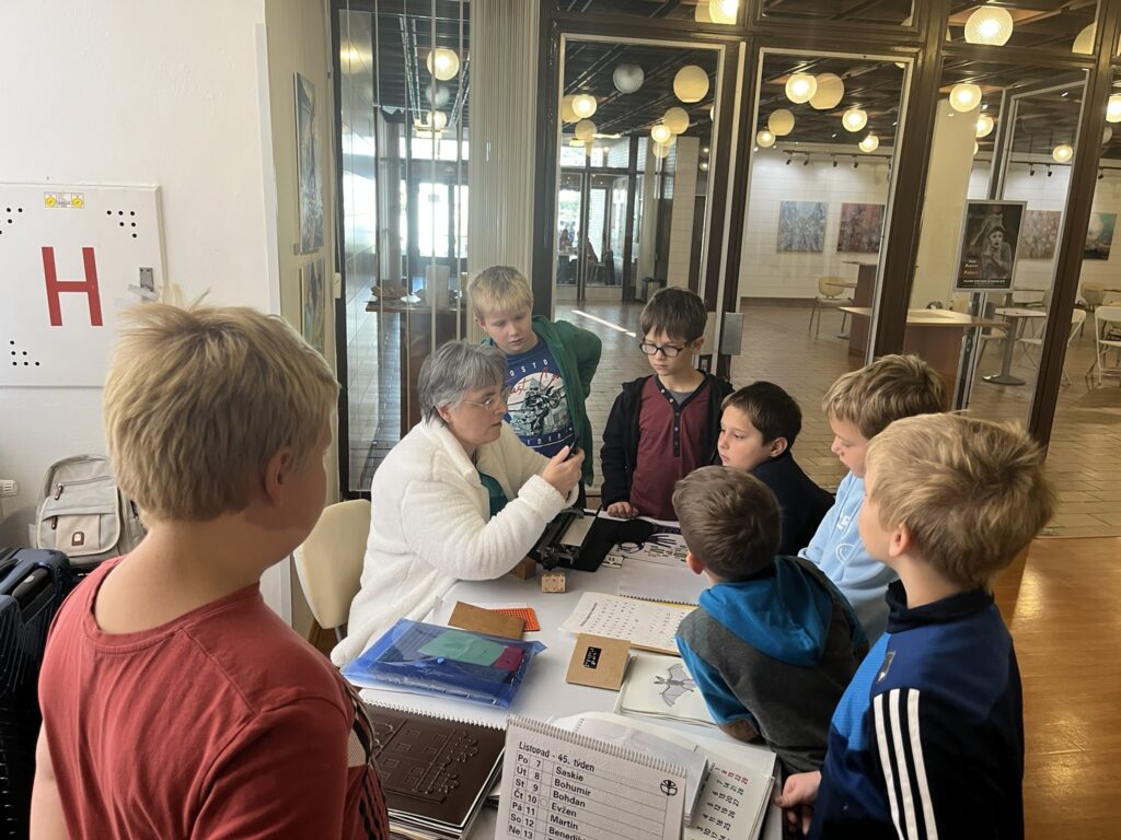 Na prvním stanovišti se děti dozvěděly o vzniku Braillova písma, prohlédly si knihy a omalovánky pro nevidomé a samy si vyzkoušely psaní na stroji pro slepce. Další lektorka přišla se svým vodicím psem a vyprávěla o tom, jak takový pes pomáhá v každodenním životě i jak probíhá jeho výcvik. Na třetím stanovišti se děti seznámily se společenskými hrami pro nevidomé a vyzkoušely si mobil i hodinky uzpůsobené lidem se zrakovým postižením.