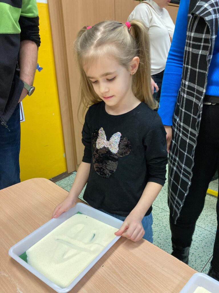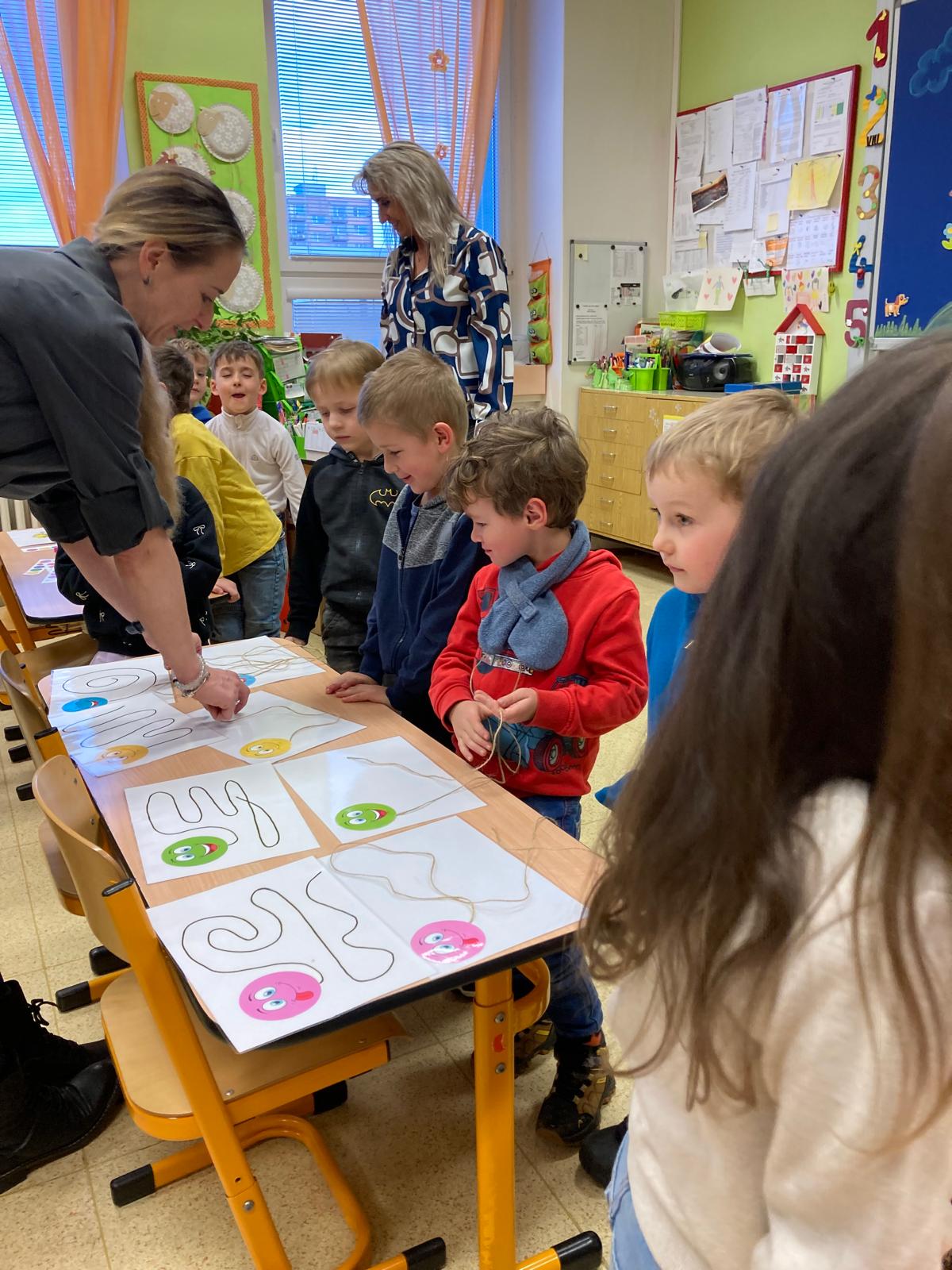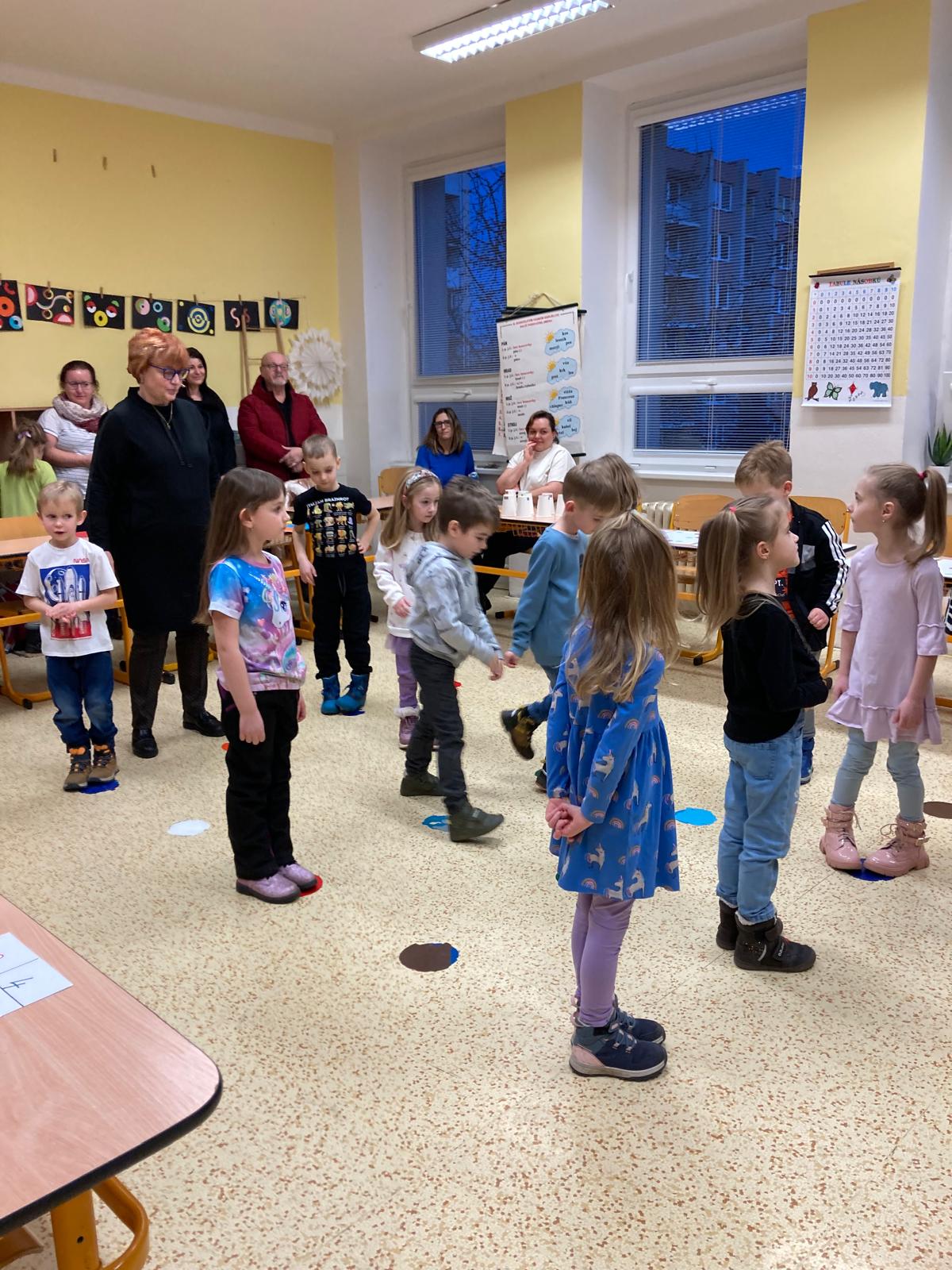 Druhé setkání proběhlo o čtrnáct dní později, koncem ledna. Tentokrát se předškoláci seznámili s paní učitelkami 1. stupně, které si pro ně připravily aktivity zaměřené na procvičování základních školních dovedností a dovedností potřebných k zápisu do 1. třídy. Program byl zahájen vystoupením pěveckého sboru pod vedením Jany Reisnerové.