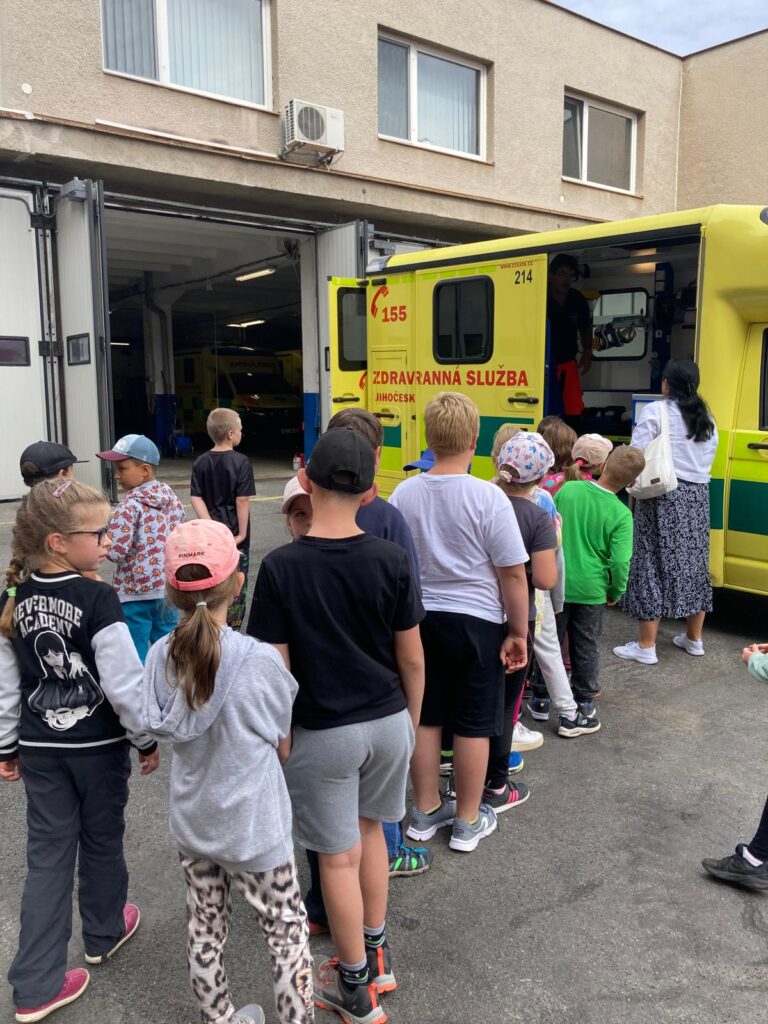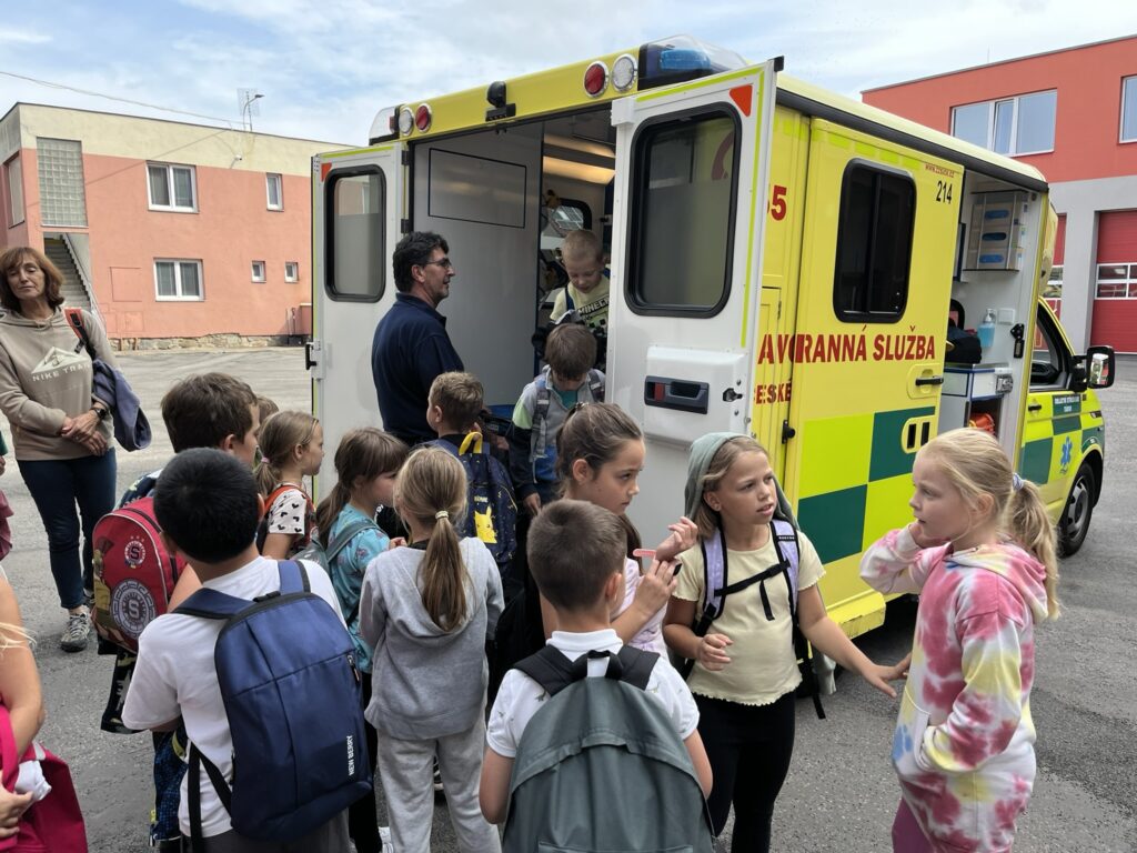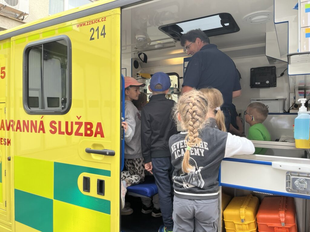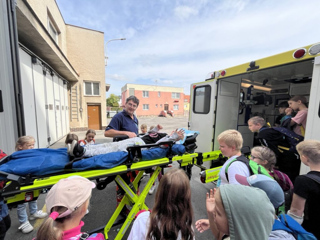 Záchranná služba nás zase nechala nahlédnout do své sanitky. Dozvěděli jsme se, kde se nachází lůžko pro pacienta, kde má lékař uložené potřebné vybavení a jak fungují přístroje, například EKG nebo dýchací přístroj. Děti si také vyzkoušely, jak se vytahuje transportní vozík a jak se používá speciální lůžko pro převoz pacientů.