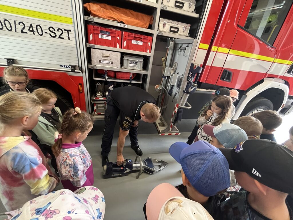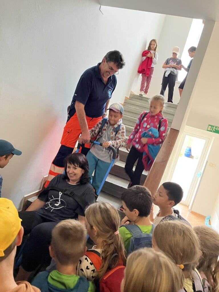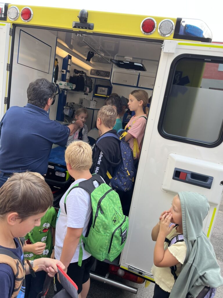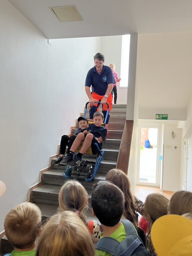 Záchranná služba nás zase nechala nahlédnout do své sanitky. Dozvěděli jsme se, kde se nachází lůžko pro pacienta, kde má lékař uložené potřebné vybavení a jak fungují přístroje, například EKG nebo dýchací přístroj. Děti si také vyzkoušely, jak se vytahuje transportní vozík a jak se používá speciální lůžko pro převoz pacientů.