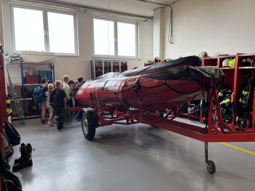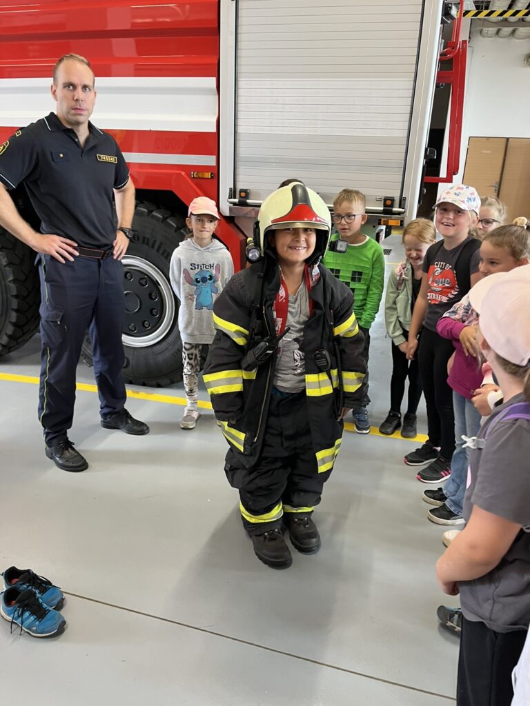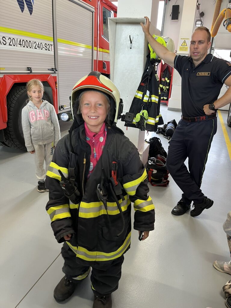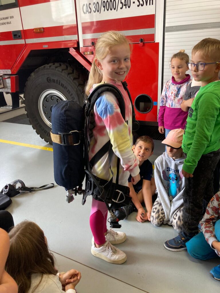 Naše dopoledne začalo přednáškou s prezentací, při které jsme si zopakovali to nejdůležitější, co bychom měli vědět v případě požáru. Poté následovala prohlídka hasičských vozů a vybavení. Děti si mohly některé věci vyzkoušet a na vlastní kůži si ověřily, že práce hasičů není vůbec jednoduchá. Velkým zážitkem bylo lezení v polygonu a ukázka slaňování z tréninkové věže.