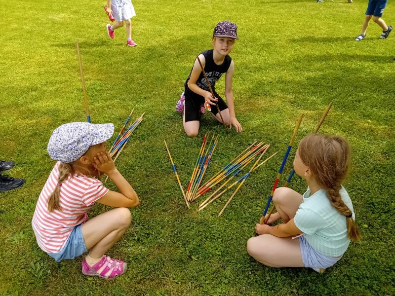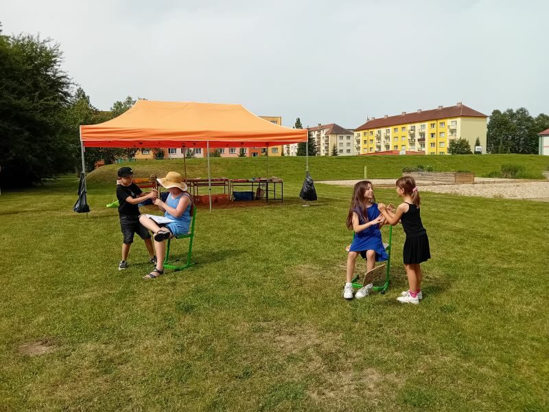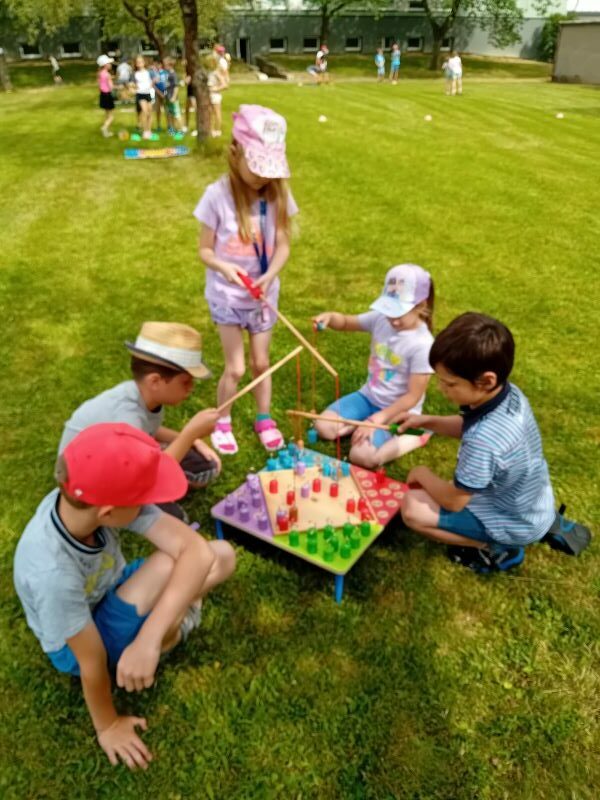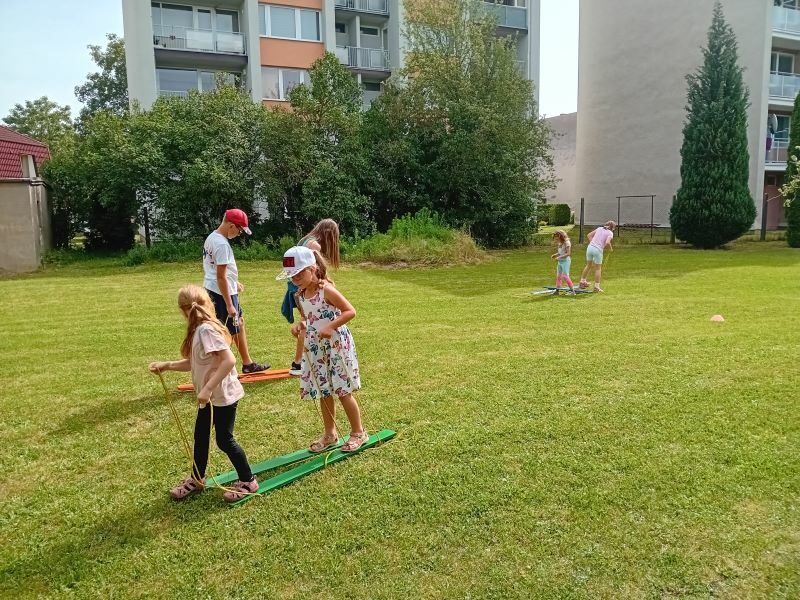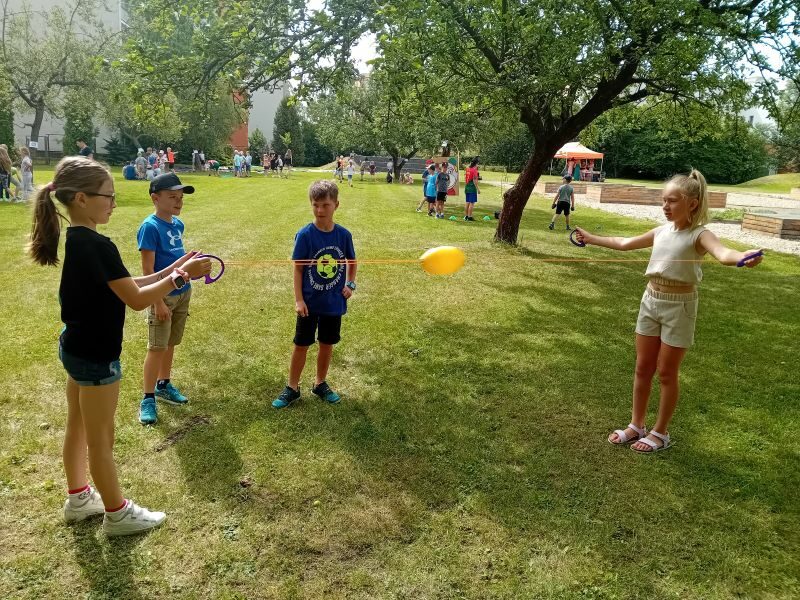 Párty stan a výzdoba, občerstvení, hudba k tanci i poslechu…Hry nachystané na stanovištích pod stromy…Ty si děti obcházely podle své volby a hrály si tam, kde je to zaujalo. Mezi nejoblíbenější patřilo velké dřevěné mikádo,  míčkochytače, šašek, srážění plechovek a i Fanfrnoch či kbelíkové chůdy…dále si děti mohly vyzkoušet střelbu do plat či na tyčky, chůzi na dřevěných lyžích a skládání obřích puzzlí.