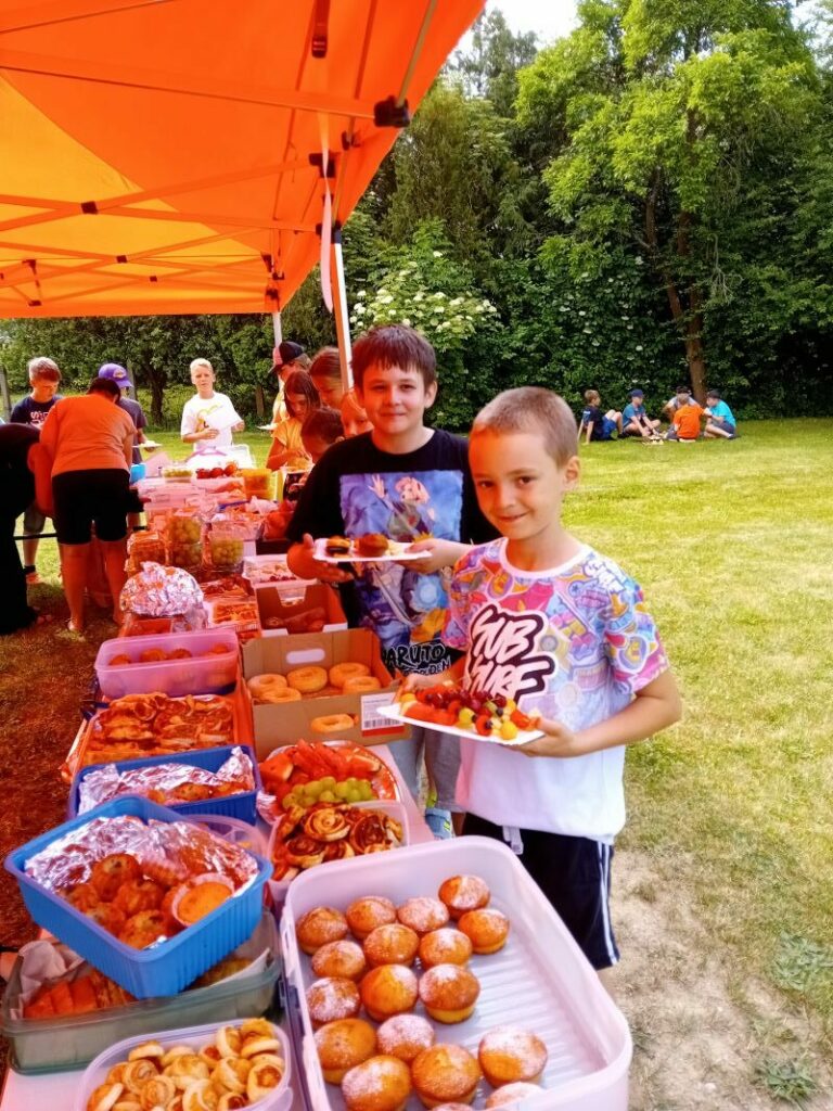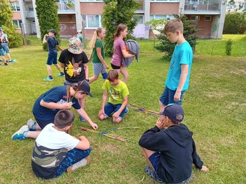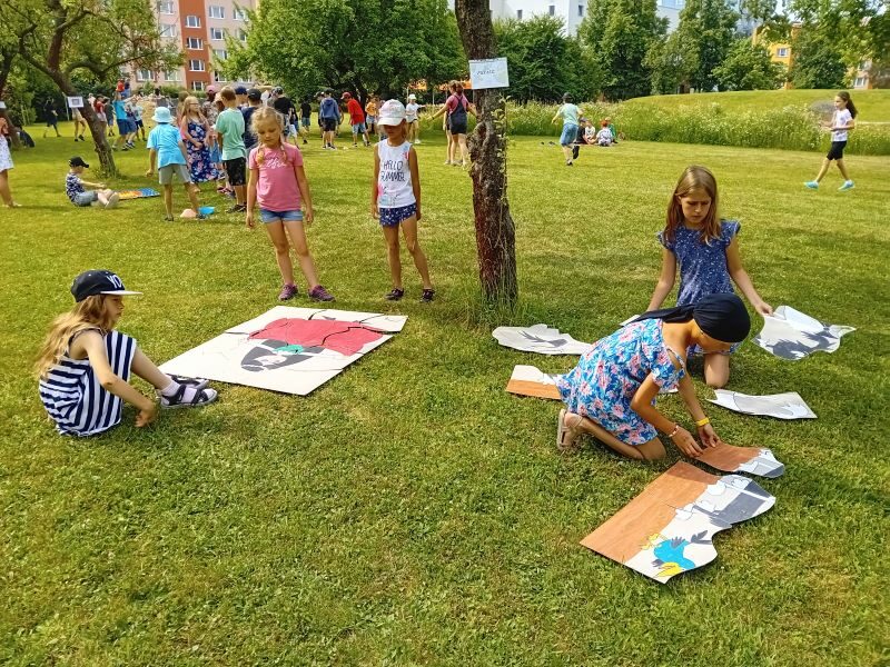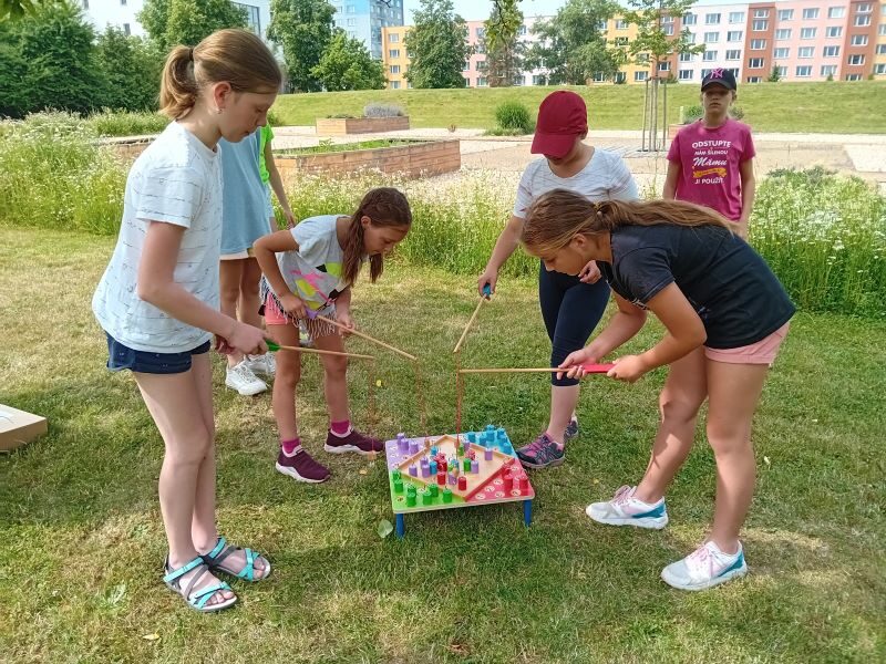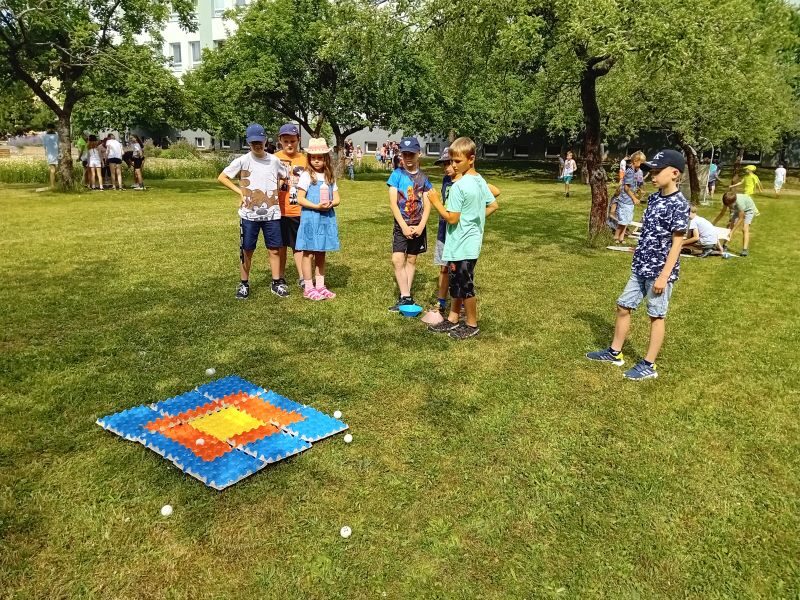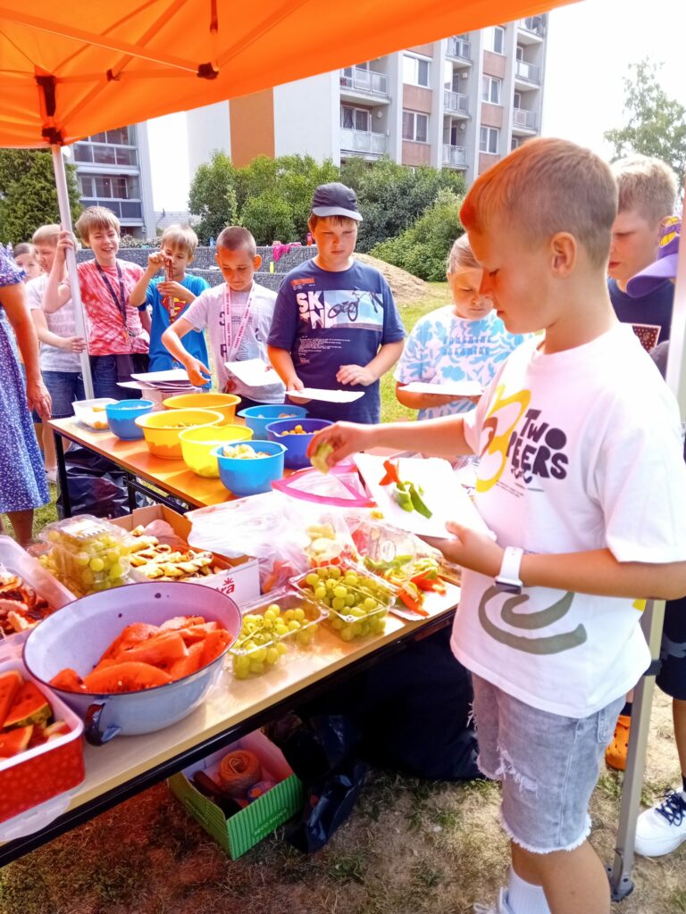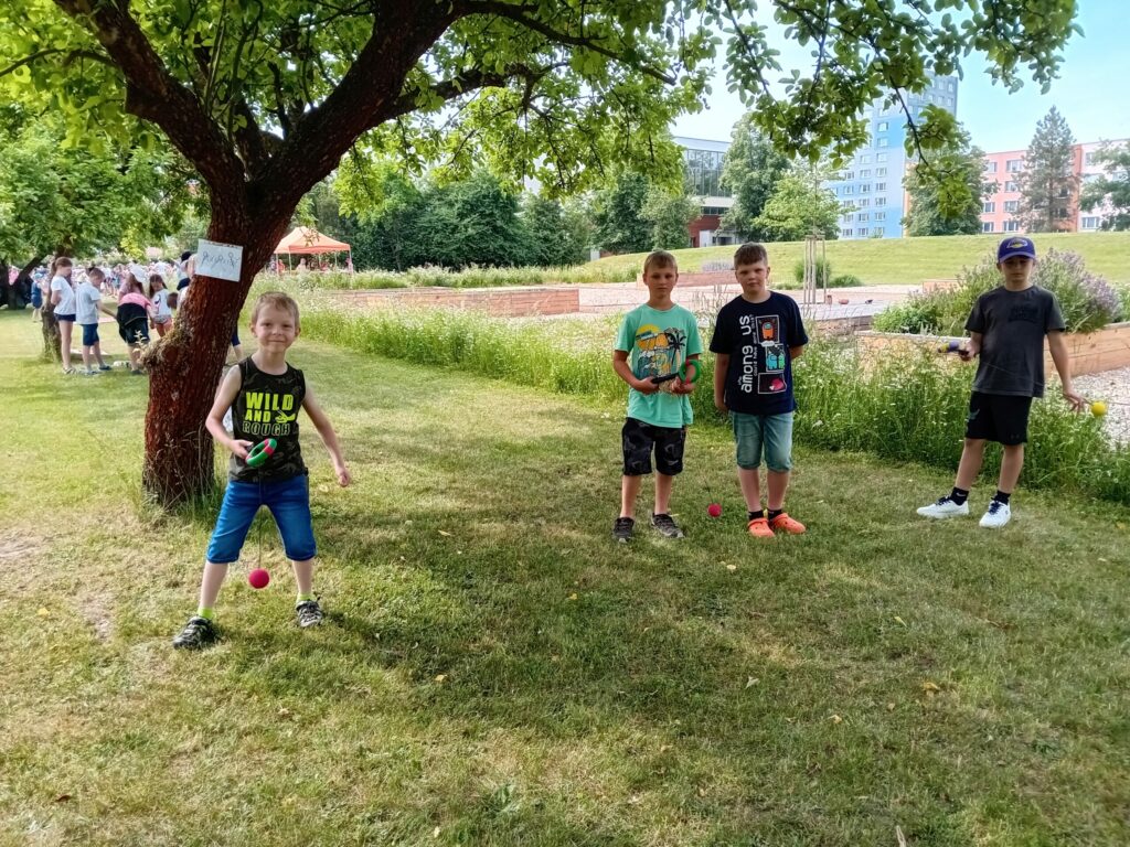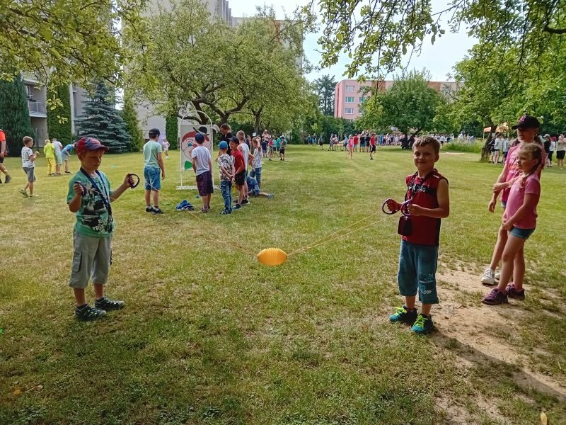 Párty výzdoba, hry, občerstvení, hudba k tanci i poslechu…Jednotlivá stanoviště si děti obcházely podle své volby a hrály si tam, kde je to zaujalo. Mezi nejoblíbenější patřilo velké dřevěné mikádo,  míčkochytače, šašek, srážění plechovek a i Fanfrnoch či kbelíkové chůdy…dále si děti mohly vyzkoušet střelbu do plat či na tyčky, chůzi na dřevěných lyžích a skládání obřích puzzlí.